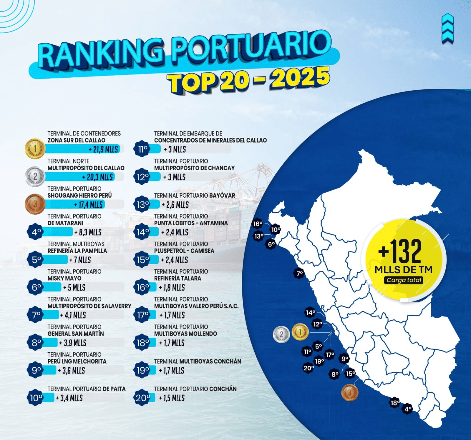 Presenta el ranking del movimiento de carga de los terminales portuarios de uso público y privado, donde muestra las primeras posiciones del movimiento portuario en toneladas métricas del periodo. Durante el período enero a diciembre 2025, lo principales terminales portuarios que movilizaron más de 4 millones de toneladas métricas respecto al total, los cuales se representa en la siguiente imagen.